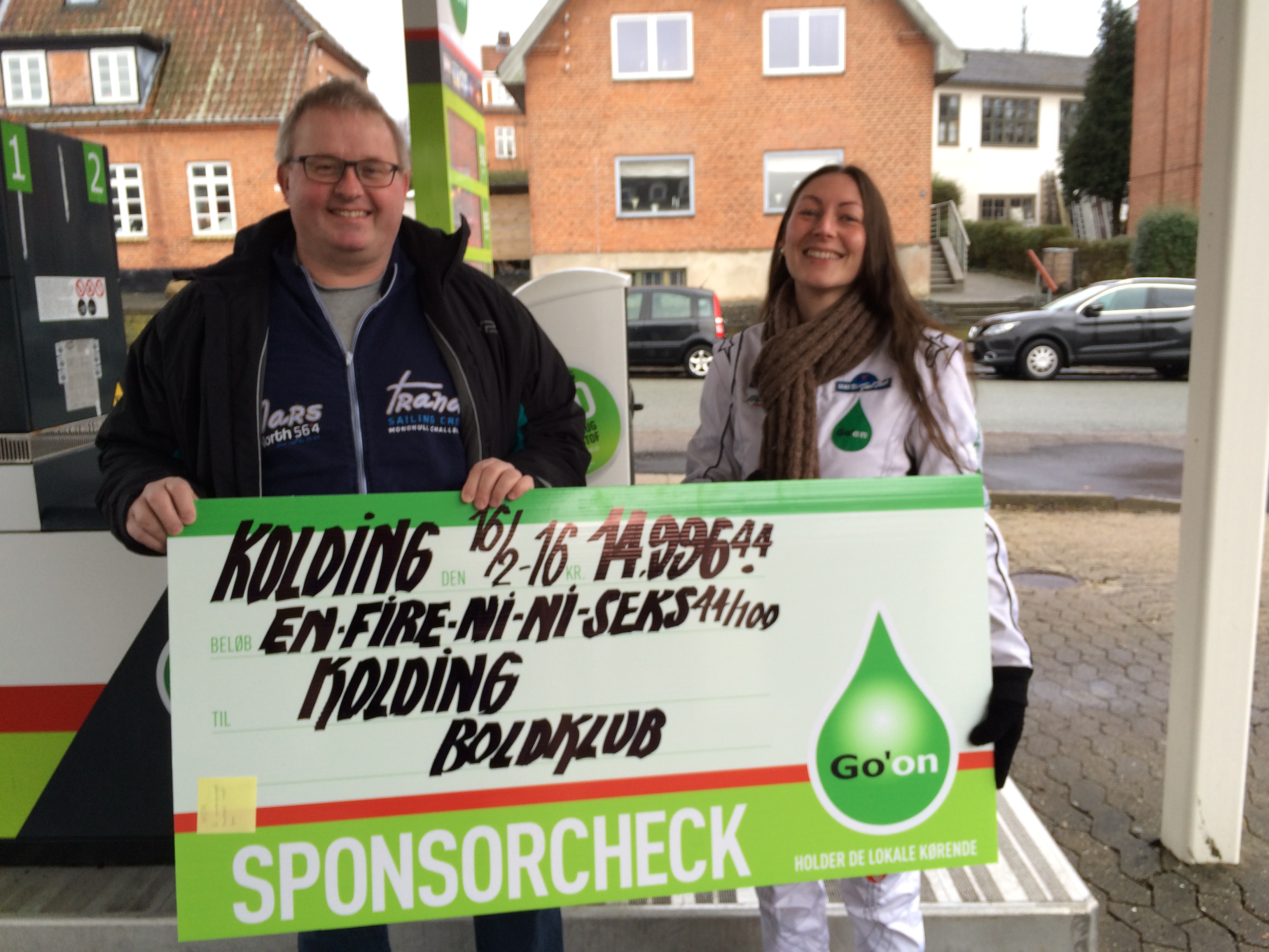 Medlemmerne af Kolding Boldklub har været flittige til at tanke benzin og diesel hos Go’on på Agtrupvej. Derfor kunne eventkonsulent Ditte Ørbæk fra det 100 procent dansk-ejede benzinselskab overrække KB-formand Allan Johansen en sponsorcheck på 14.996,44 kroner. I dagens anledning var der billig benzin og diesel i tre timer. KB har ikke forlænget sponsoraftalen med Go’on, men er til gengæld med i opløbet om at blive kåret som Årets forening. En titel, der udløser en kontant sum på 250.000 kroner.